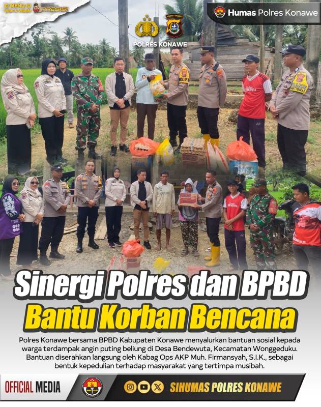 IDEALITA.ID | KONAWE – Dua rumah warga di Desa Bendewuta, Kecamatan Wonggeduku, Kabupaten Konawe, rusak akibat diterjang angin puting beliung pada Rabu siang (29/10/2025). Tak butuh waktu lama, aparat Polres Konawe bersama BPBD setempat langsung turun tangan menyalurkan bantuan bagi warga terdampak.