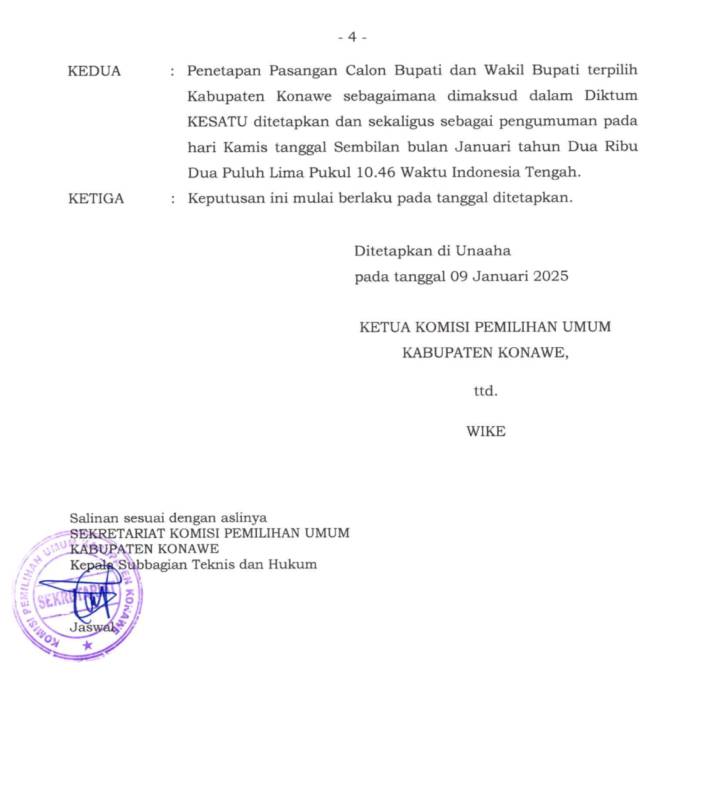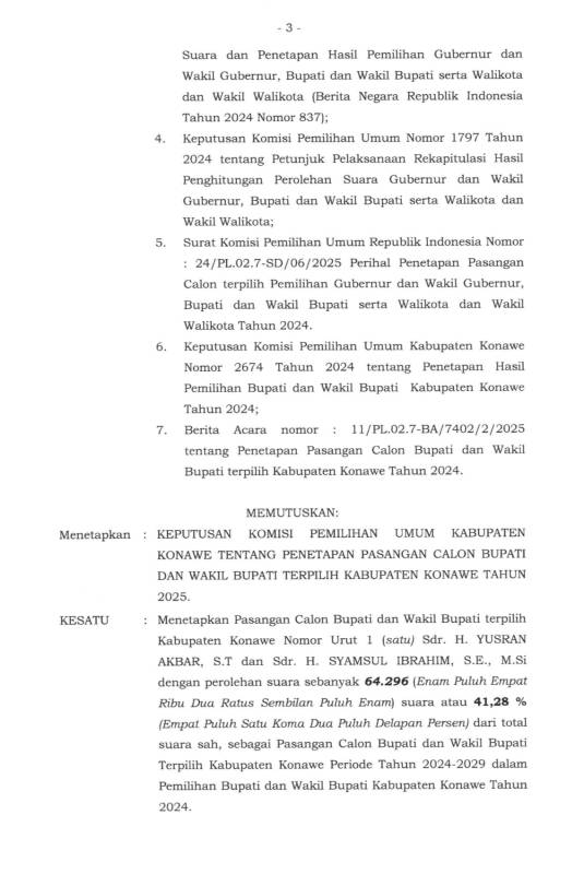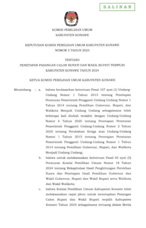 Berikut Surat Keputusan Rapat Pleno Terbuka oleh KPU Konawe: