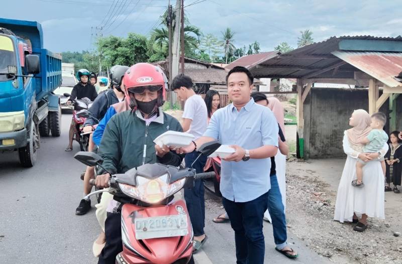 Wakil Ketua Dewan Perwakilan Rakyat Daerah (DPRD) Konawe, Nasrullah Faizal, SH, bersama pengurus Masjid Al Ihsan, turun langsung ke jalan untuk membagikan takjil kepada masyarakat setempat dan para pengguna jalan yang melintas, Minggu 23 Maret 2025.