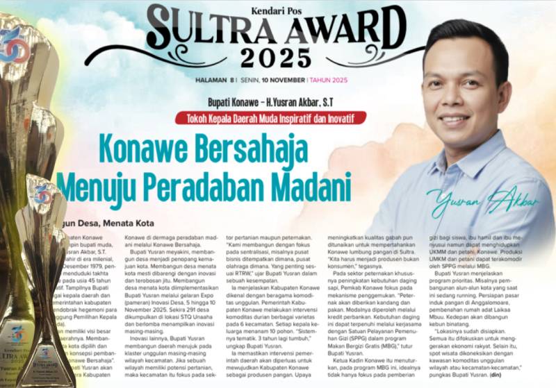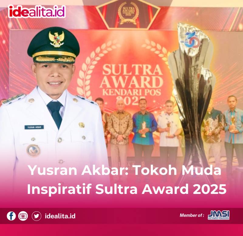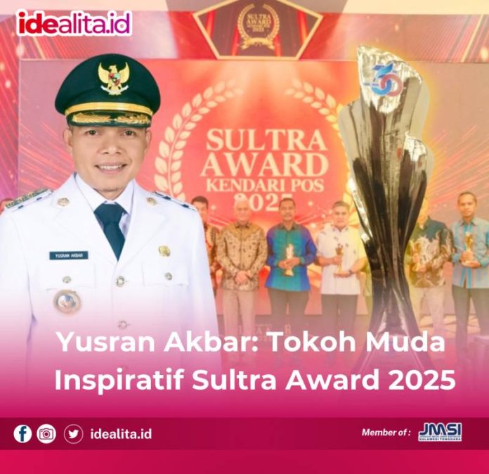 IDEALITA.ID: KENDARI – Langkah Bupati Konawe Yusran Akbar dalam menata dan membangun daerah kembali mendapat pengakuan publik. Dalam ajang Sultra Award Kendari Pos 2025, Yusran dinobatkan sebagai Tokoh Muda Inspiratif dan Inovatif atas kiprahnya membangun Konawe berbasis gagasan dan aksi nyata.